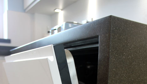 The AEG Dishwasher is discreetly hidden behind a gloss handless door to maintain the clean look to the design. Also shown is the feature seamless downturns that give the worktop ends a quality finish.