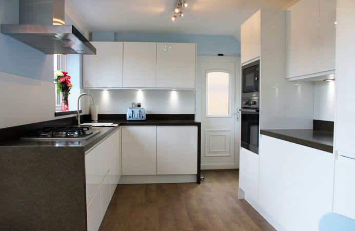 In addition to the kitchen installation Lamont also sourced and fitted the laminate flooring and to finish of the look we laminated the internal door to match the style of the kitchen doors.